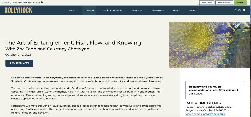 Join Drs Courtney Chetwynd and Zoe Todd at the Hollyhock Centre on Cortes Island, British Columbia for an immersive four-day research-creation workshop on ‘The Art of Entanglement: Fish, Flow, and Knowing’.