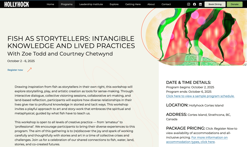 Join Drs Courtney Chetwynd and Zoe Todd at the Hollyhock Centre on Cortes Island, British Columbia for an immersive four-day research-creation workshop on ‘Fish As Storytellers: Intangible Knowledge and Lived Practices’.